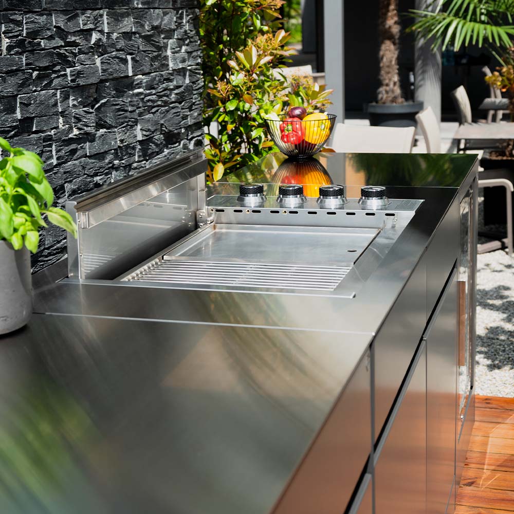Con il nostro modulo barbecue a gas, potrete preparare piatti versatili e deliziosi all'aria aperta! Il barbecue a gas in acciaio inox da incasso è un prodotto di qualità del marchio Indu+. Il barbecue a gas è dotato di quattro bruciatori e di un vassoio di raccolta del grasso. La superficie di cottura a due zone comprende una griglia classica e una piastra teppanyaki, su cui è possibile preparare tutti i tipi di ingredienti (ad esempio: carne, pesce, verdure o uova). Entrambe le superfici di cottura sono rimovibili, per facilitare la pulizia della griglia.